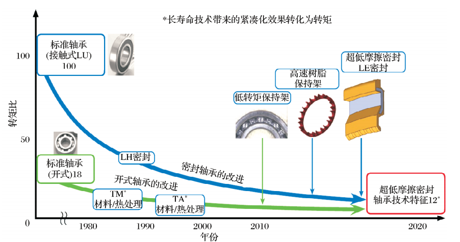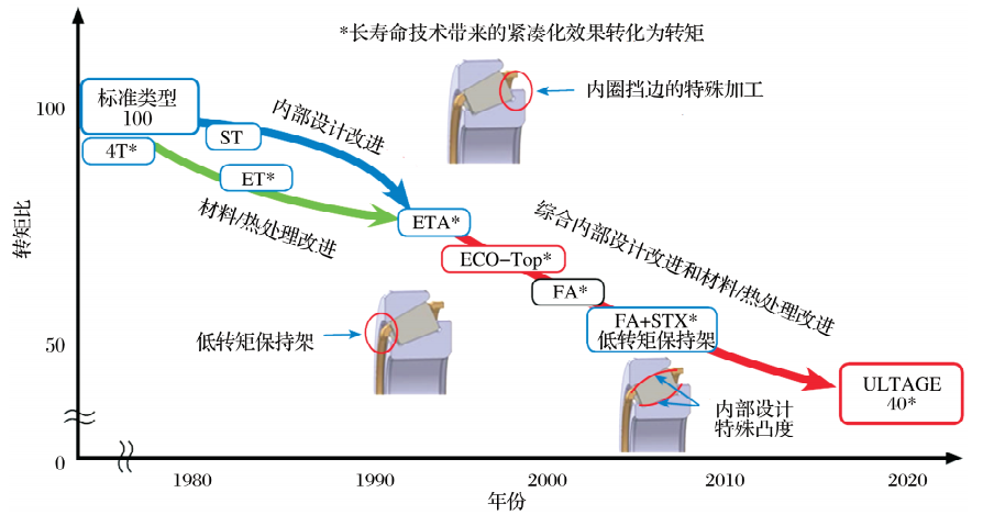 不同類型深溝球軸承的結(jié)構(gòu)和性能特點(diǎn)見表1。通過比較轉(zhuǎn)矩,自20世紀(jì)80 年代以來深溝球軸承的技術(shù)史如圖2所示。
