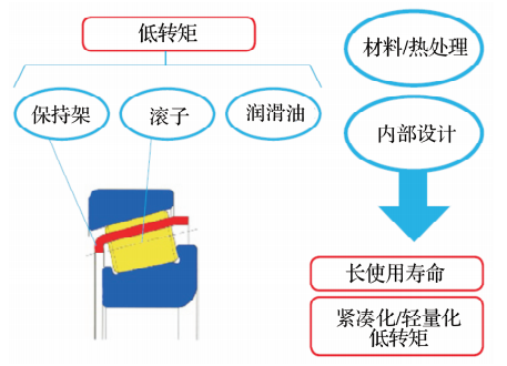通過材料、熱處理、內(nèi)部設(shè)計(jì)參數(shù)的變化以及諸如密封、保持架、潤(rùn)滑脂的改進(jìn)(圖1),實(shí)現(xiàn)低轉(zhuǎn)矩的要求和緊湊化、輕量化的設(shè)計(jì)。