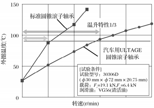 在溫升試驗(yàn)中,其溫升為標(biāo)準(zhǔn)軸承的1/3,證實(shí)了其優(yōu)越的卡死抗力,如圖10所示。如圖7所示,優(yōu)化了擋邊和滾子端面形狀,得到了優(yōu)越的卡死抗力。