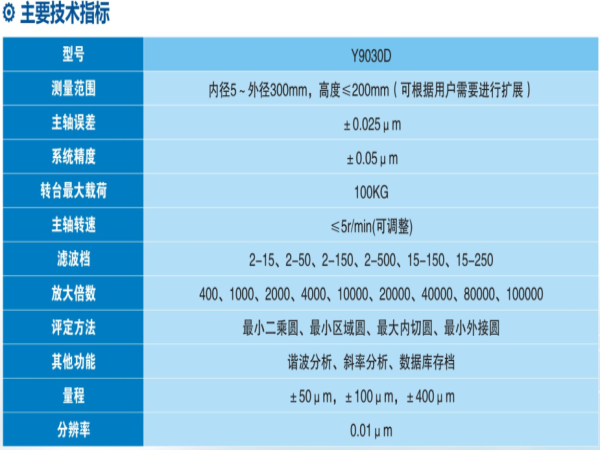 Y90D系列圓度測量儀是以大承重高精度氣浮主軸為基準,采用計算機測量系統(tǒng)的轉臺式通用型圓度儀,適用于大型回轉體工件的的圓度、波紋度、同軸度等參數(shù)的測量,主要應用于大型精密機械制領域。儀器主要由氣浮主軸、精密調平調心工作臺、花崗巖臺面和立柱、高精度電感測頭、精密旋轉編碼器、驅動控制電箱、高精度測量電箱、空氣過濾干燥系統(tǒng)以及基于windows XP的專用測量分析軟件組成。